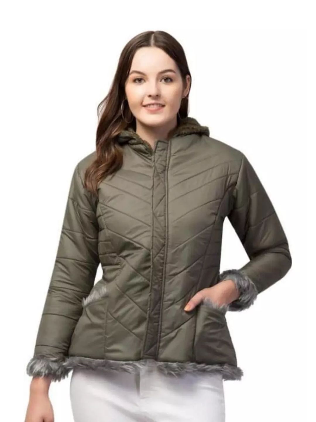 Product Type: Quilted Fur Puffer Jacket for WomenFabric: PolyesterColour: Olive GreenSleeve Length: Long SleevesPattern: SolidSizes: S (Bust Size: 36 in, Length Size: 24 in)M (Bust Size: 38 in, Length Size: 24 in)Country of Origin: India