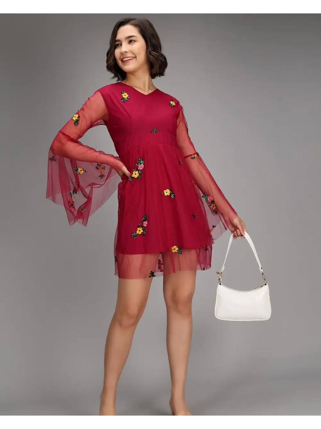 Red Floral Net Mini Dress for Women that has intricate floral details, long sleeves and a mini length. This net floral mini dress is a gorgeous piece that promises you your dreamy look.