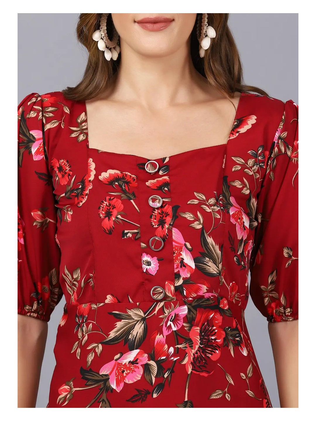 Product Name: Red Floral Puff Sleeve Maxi Dress for Women