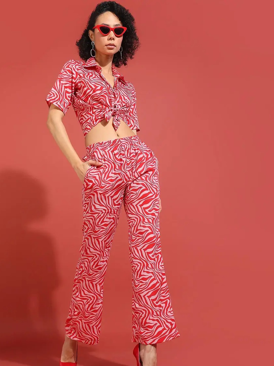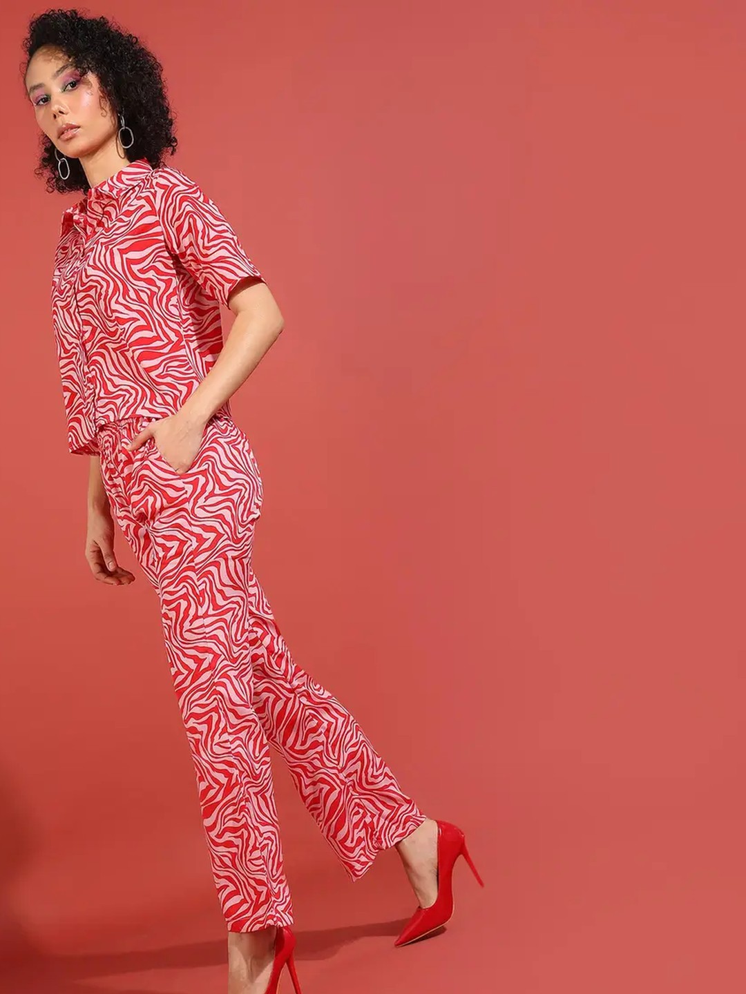 Red Printed Shirt Co-ord Set for Women that has intricate prints and a slim fit. This printed shirt co-ord set can be styled for a chic laidback look.