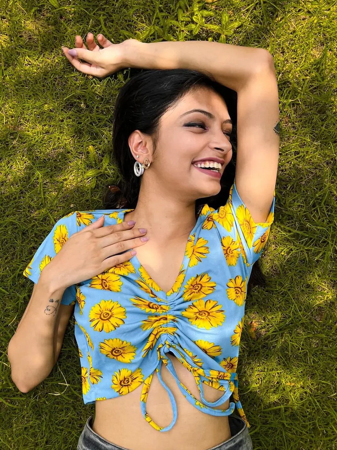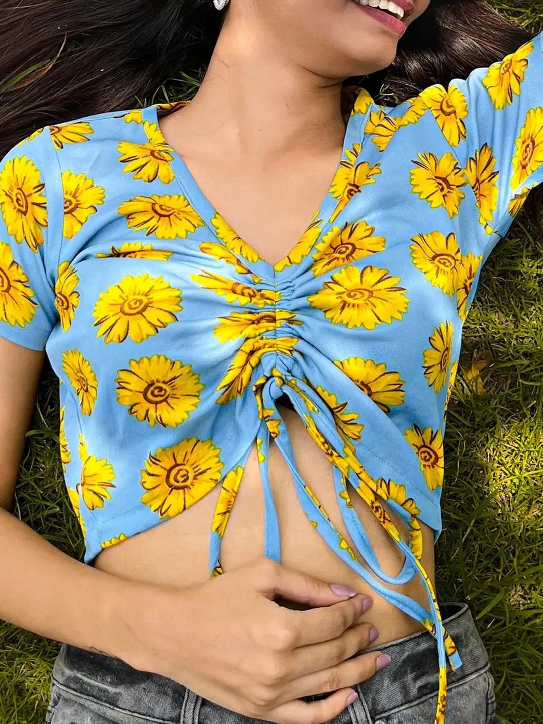 Get the serene allure of coastal charm with our Ruched Floral CropTop. Crafted with a delightful blue floral pattern, this Ruched Floral CropTop breezy piece evokes the tranquillity of seaside vistas, perfect for adding a touch of effortless casual look paired with any bottom.