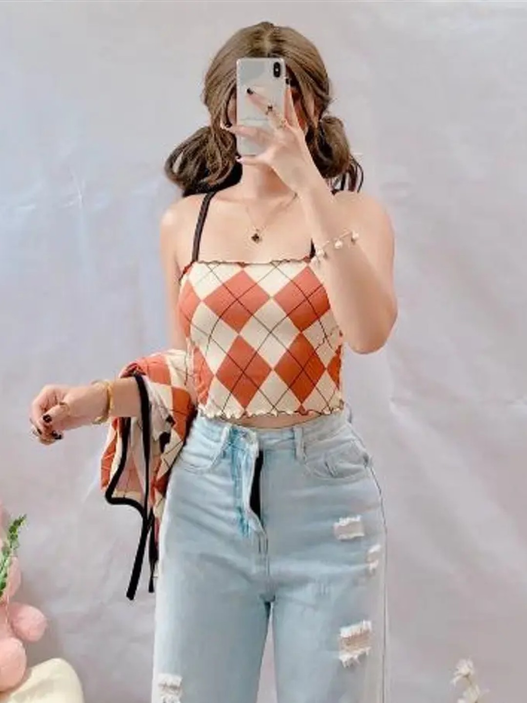 Rusty Orange Checked Top with Shrug for Women that has a cropped length and a bodycon fit. This checked top with shrug can be styled with solid bottoms for a flattering casual look.