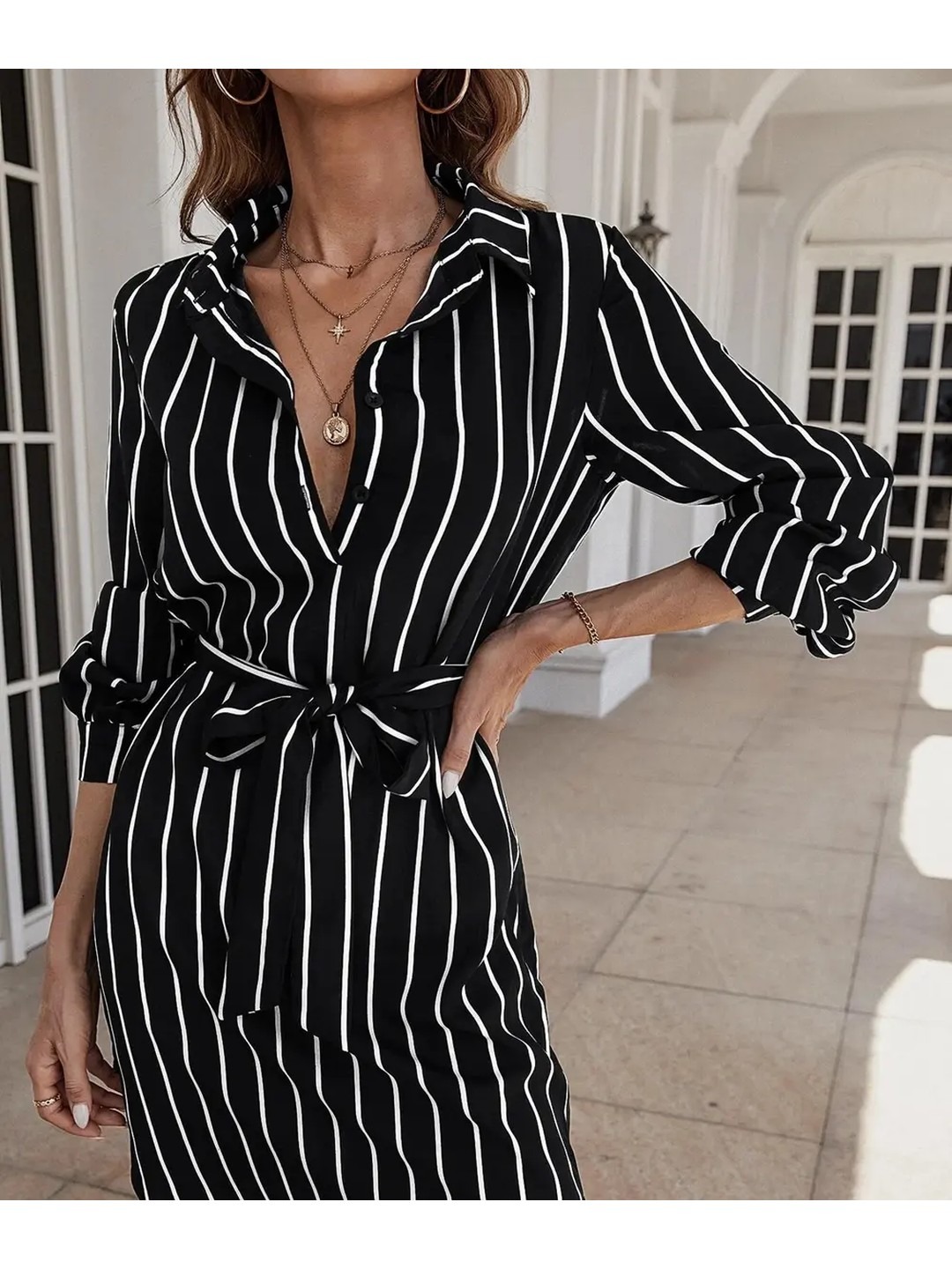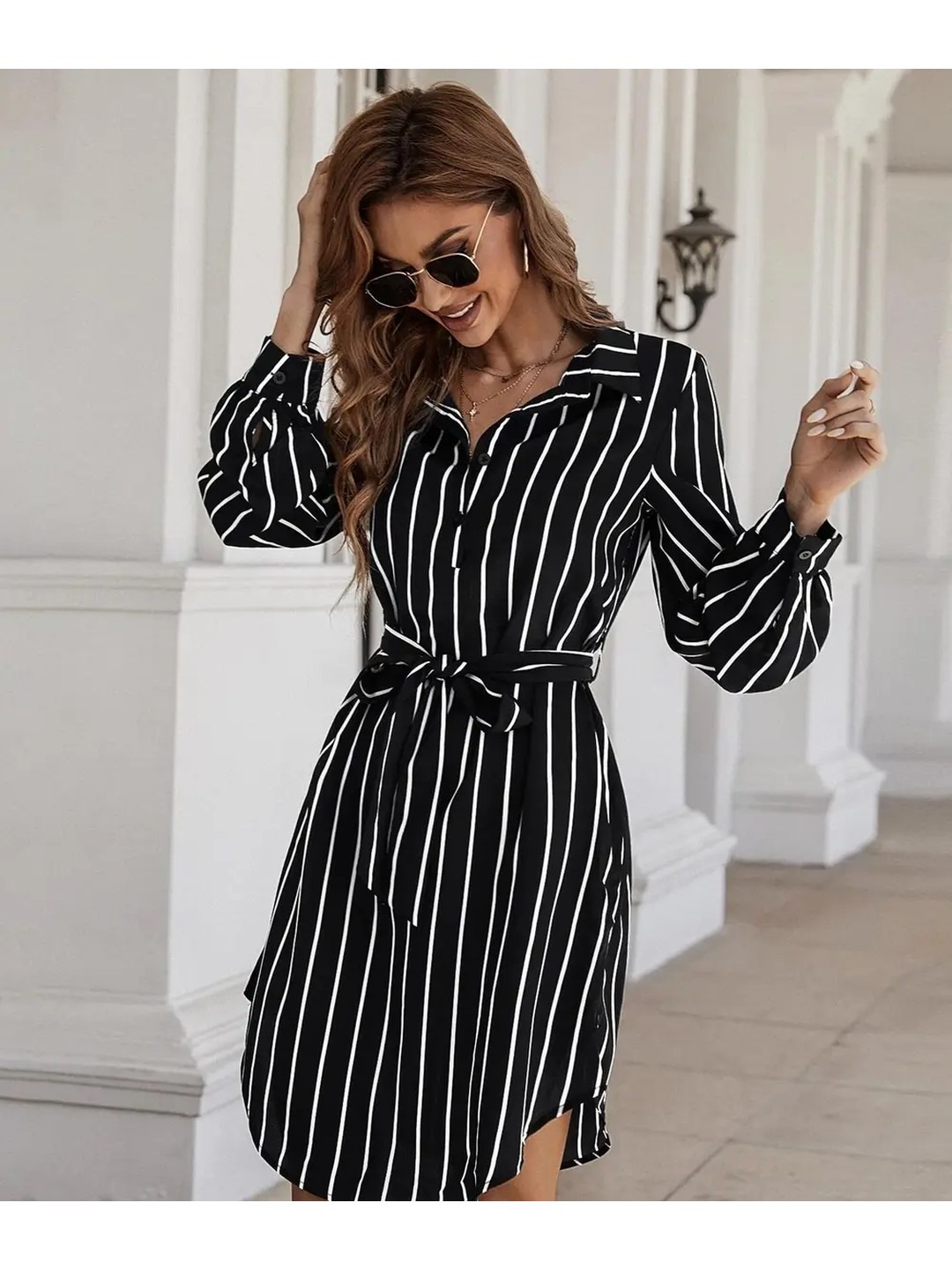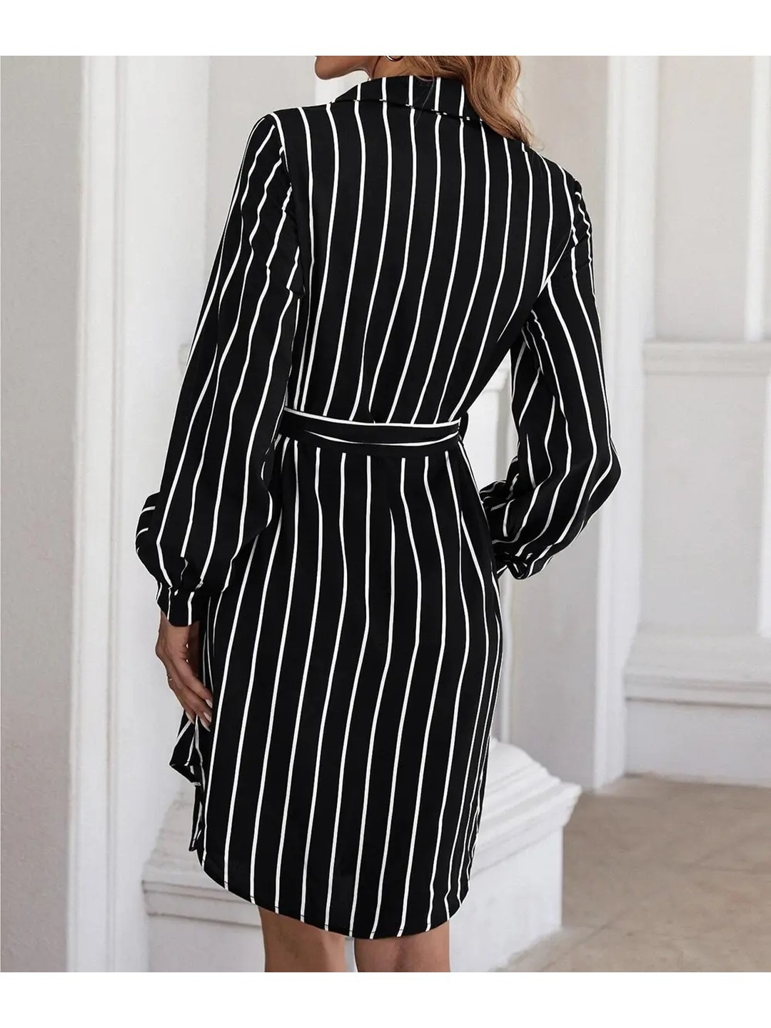 Product Name: Selvia Black Vertical Stripes Midi Shirt Dress for Women