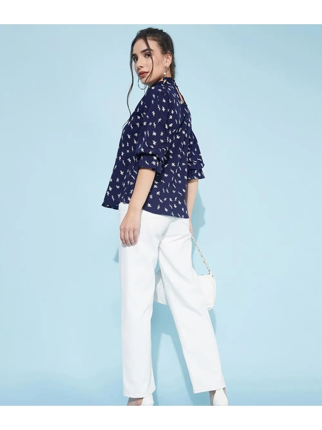 Product Name: Selvia Blue Printed High Neck Ruffle Top for Women