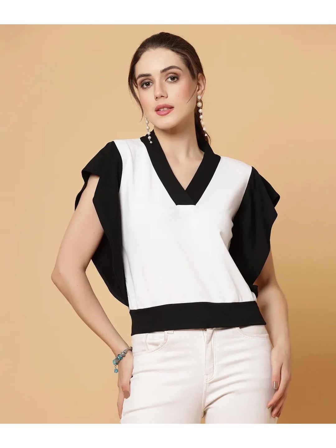 Selvia Contrast Ruffle Top for Women that has ruffled sleeves, v-neck and contrast details. This lycra top is super stretchy, comfy and light that makes a great outfit for fun parties.