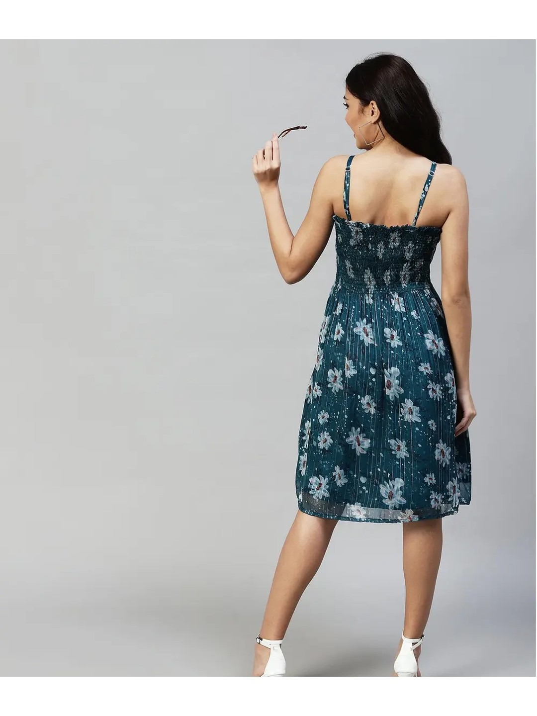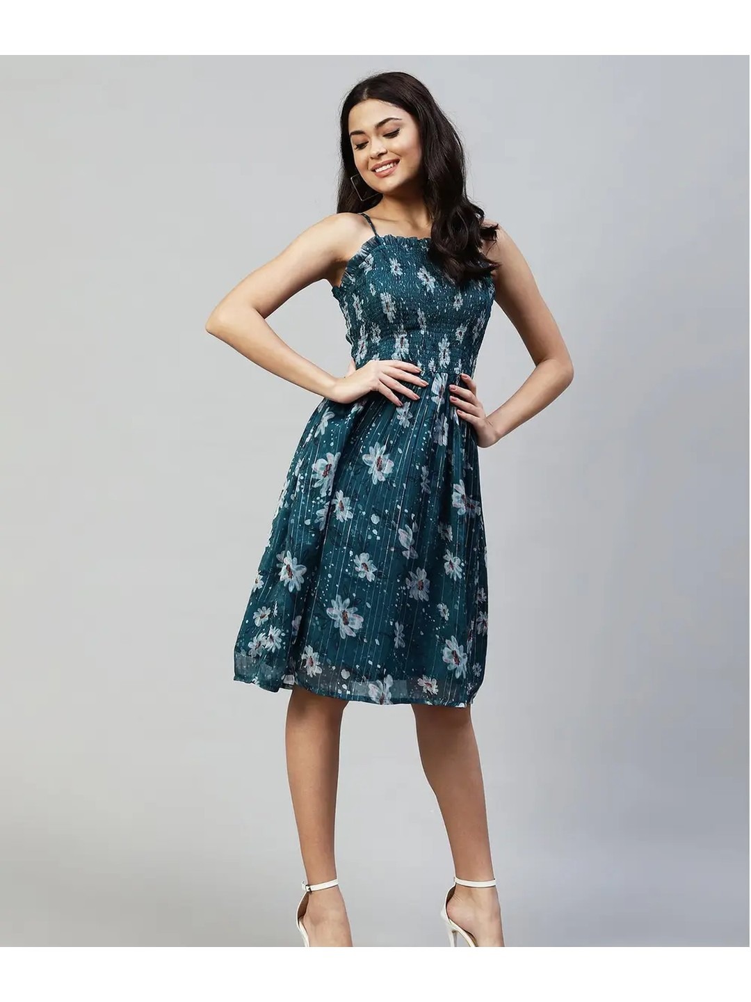 Selvia Green Floral Smocked Midi Dress for Women that has a sleeveless cut, smocked feature and intricate floral prints with a slim fit. This crepe midi dress has a fit and flare style that can be styled with heels and simple accessories for a flattering look.