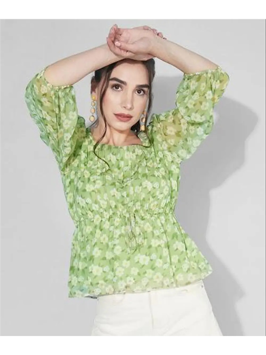 Selvia Green Floral Smocked Regular Top for Women that has vibrant floral prints, three-quarter sleeves, a round neck and a defined waist. Made with georgette fabric, this top is super light, comfy and easy to style with solid bottoms and quirky accessories for a flattering look.