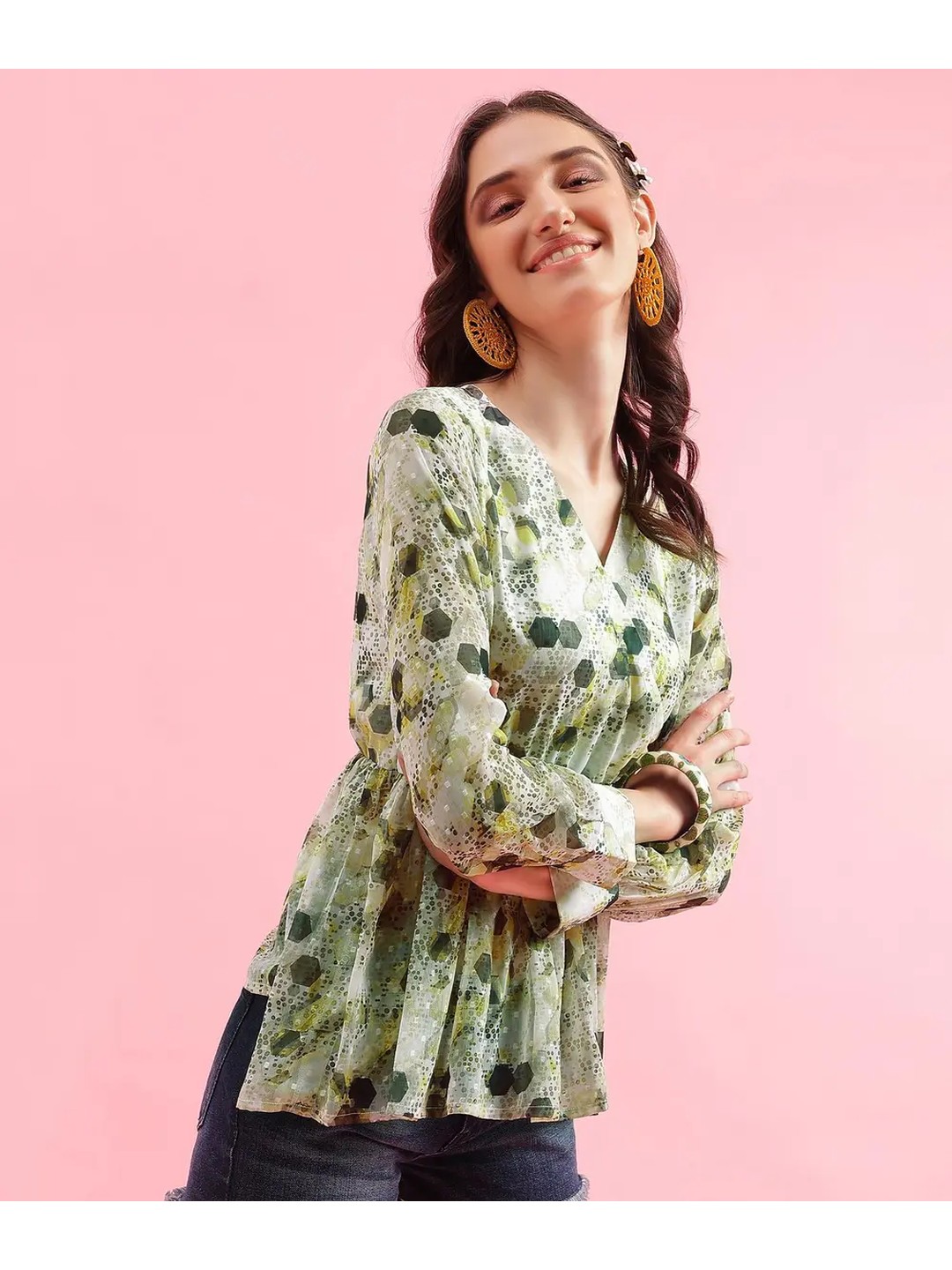 Product Name: Selvia Green Printed Wrap Peplum Top for Women