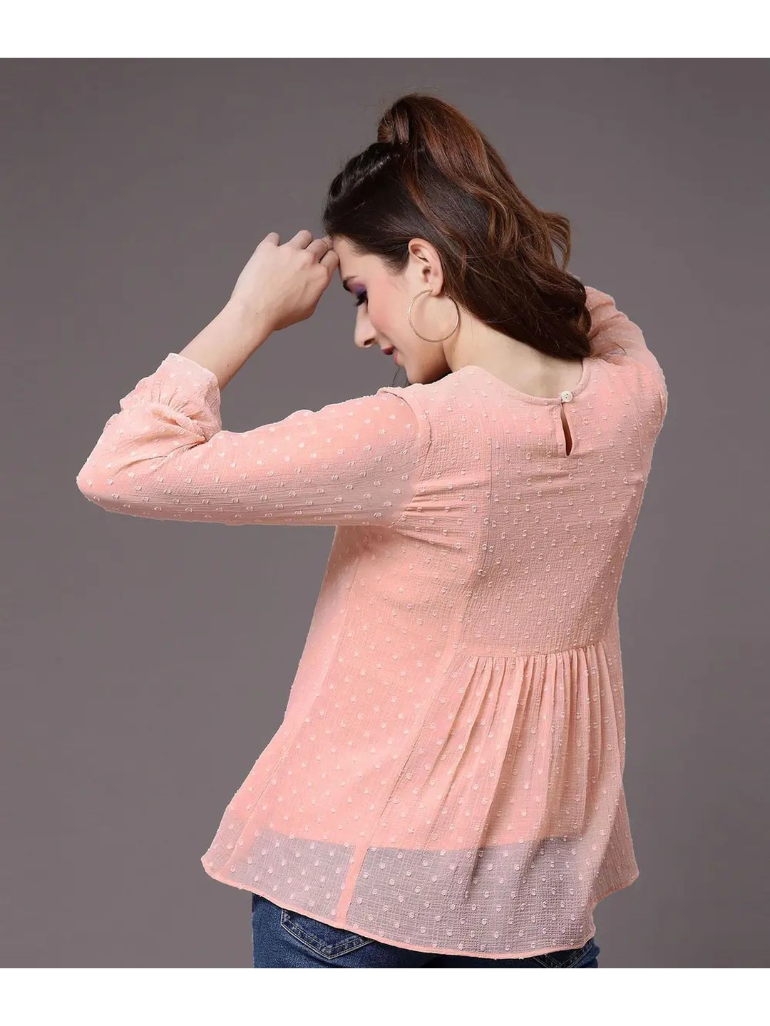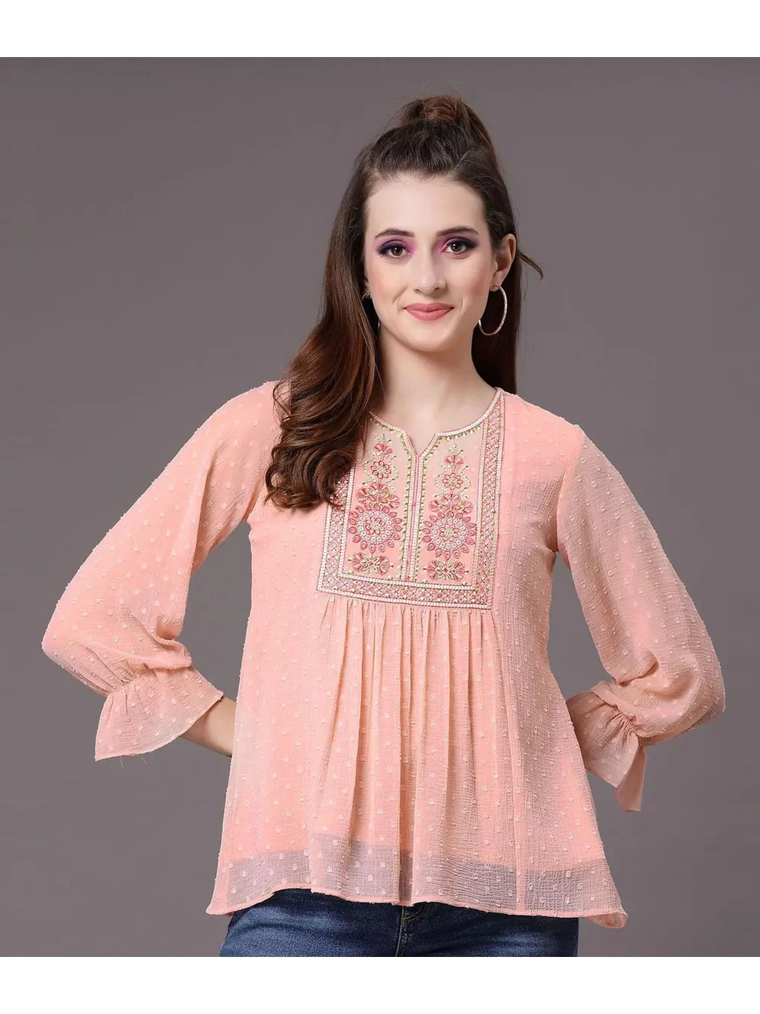 Selvia Pink Embroidered Butti Work Tunic Kurti for Women that has intricate embroidery, three-quarter sleeves and a regular length. This georgette tunic kurti has delicate butti work that adds an elegant texture to this kurti. Style it with jeans and simple accessories for a fusion look.