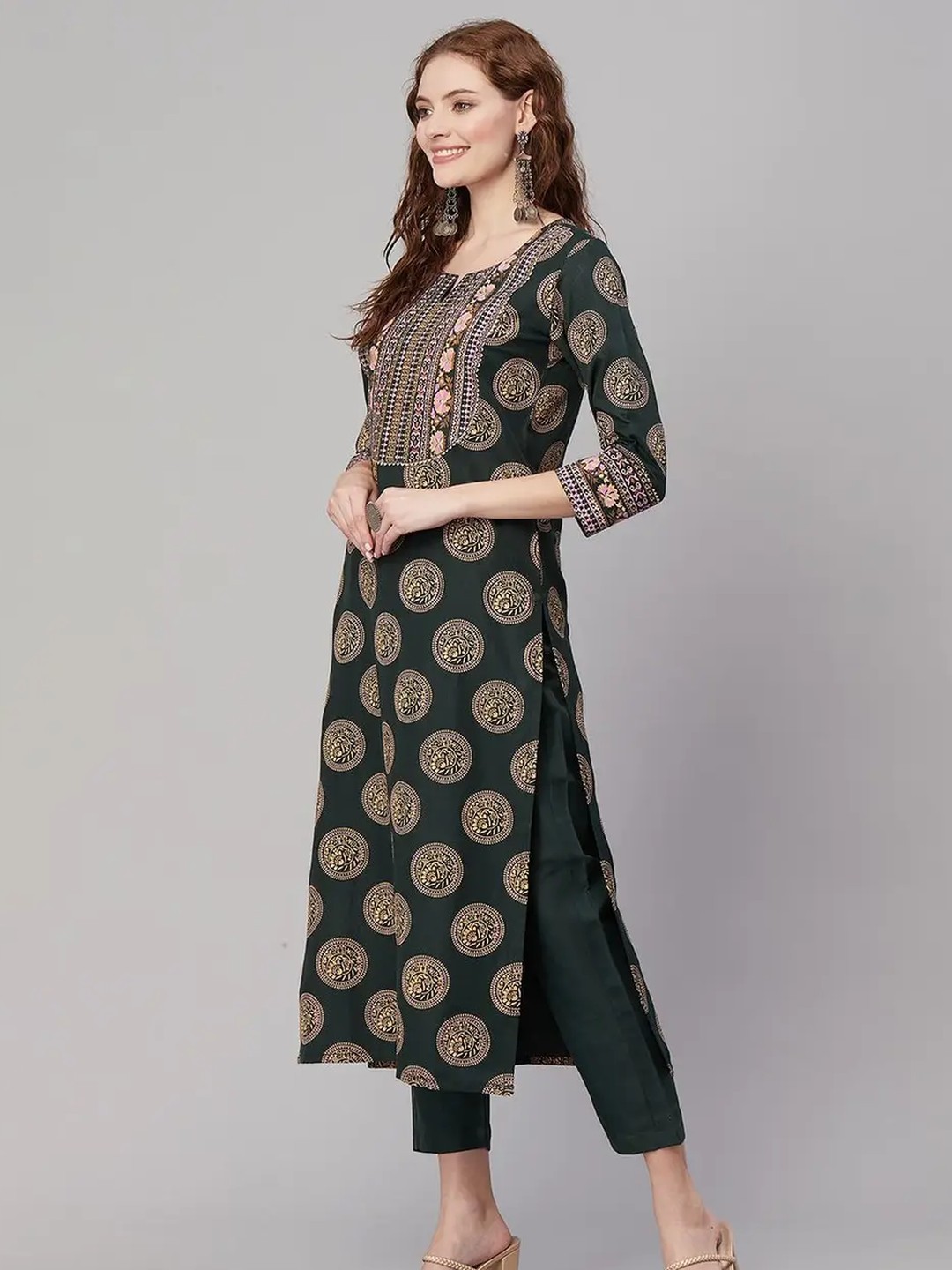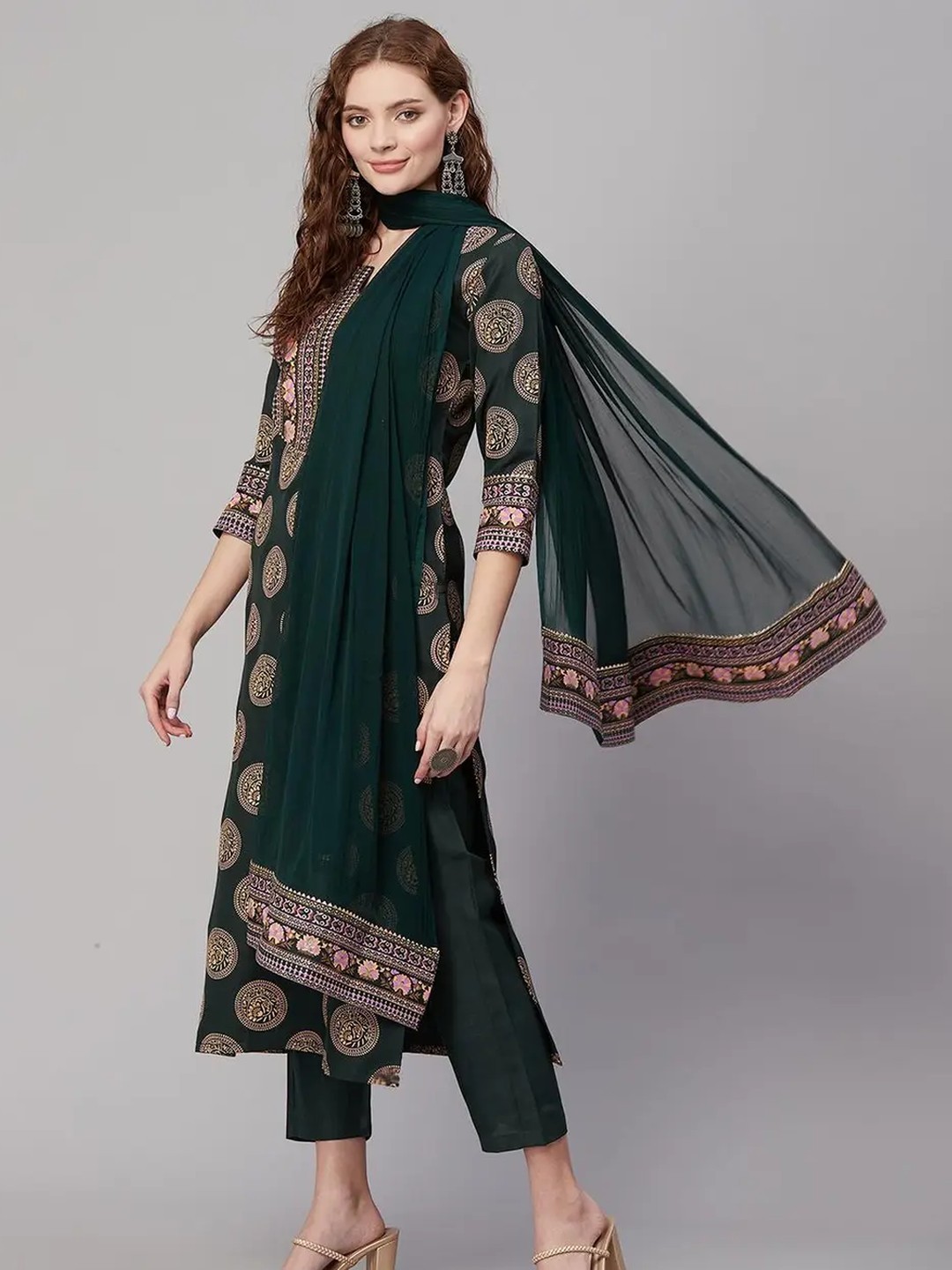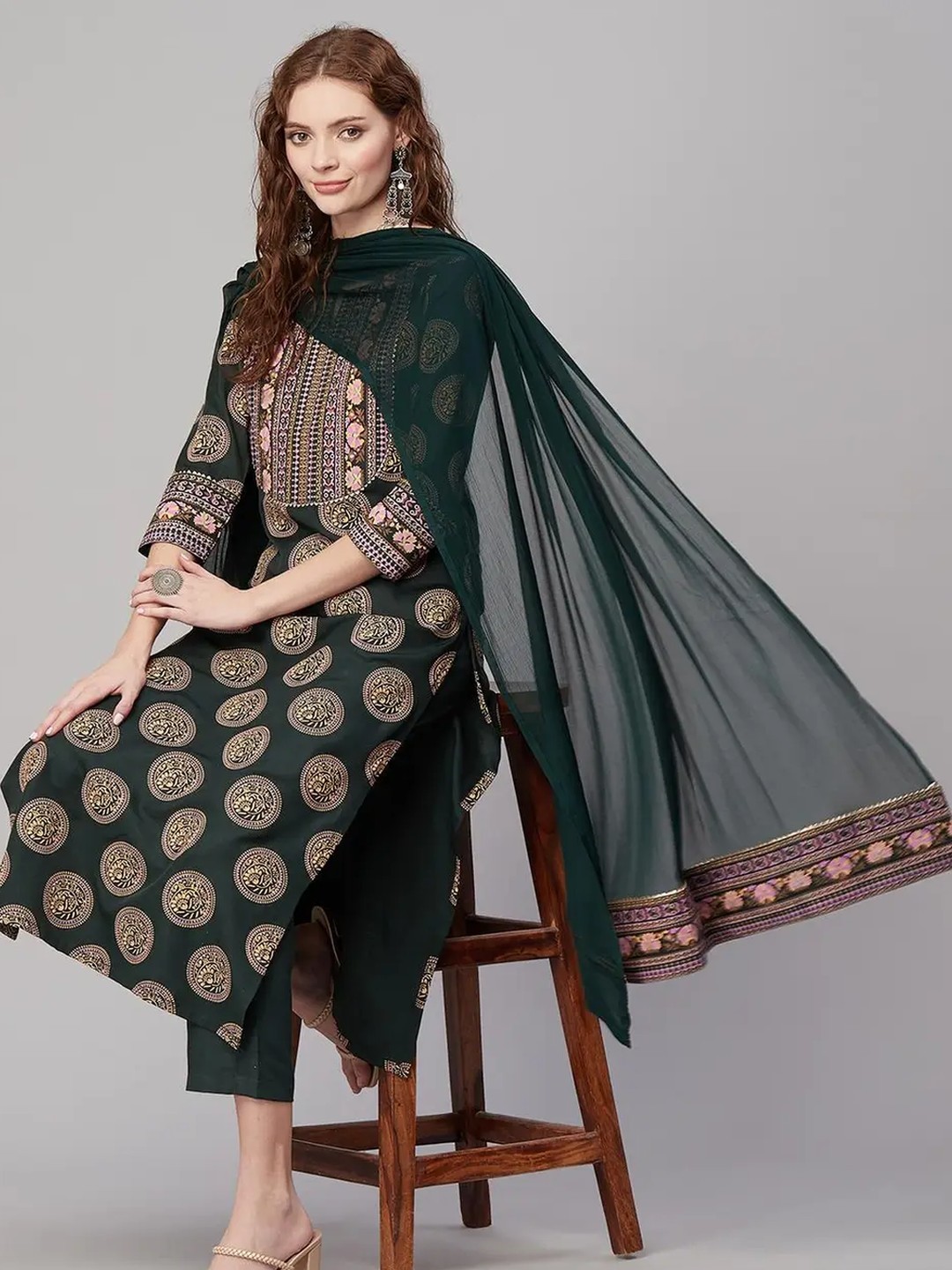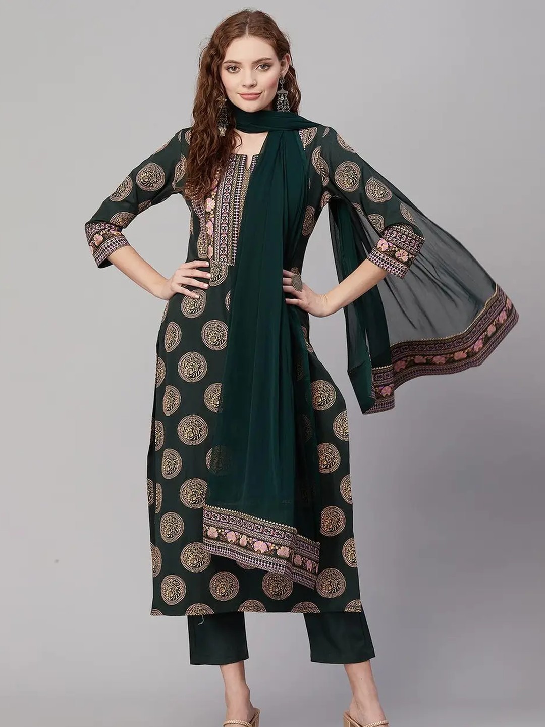 Product Name: Shri Ram Dark Green Ethnic Printed Kurta Set for Women