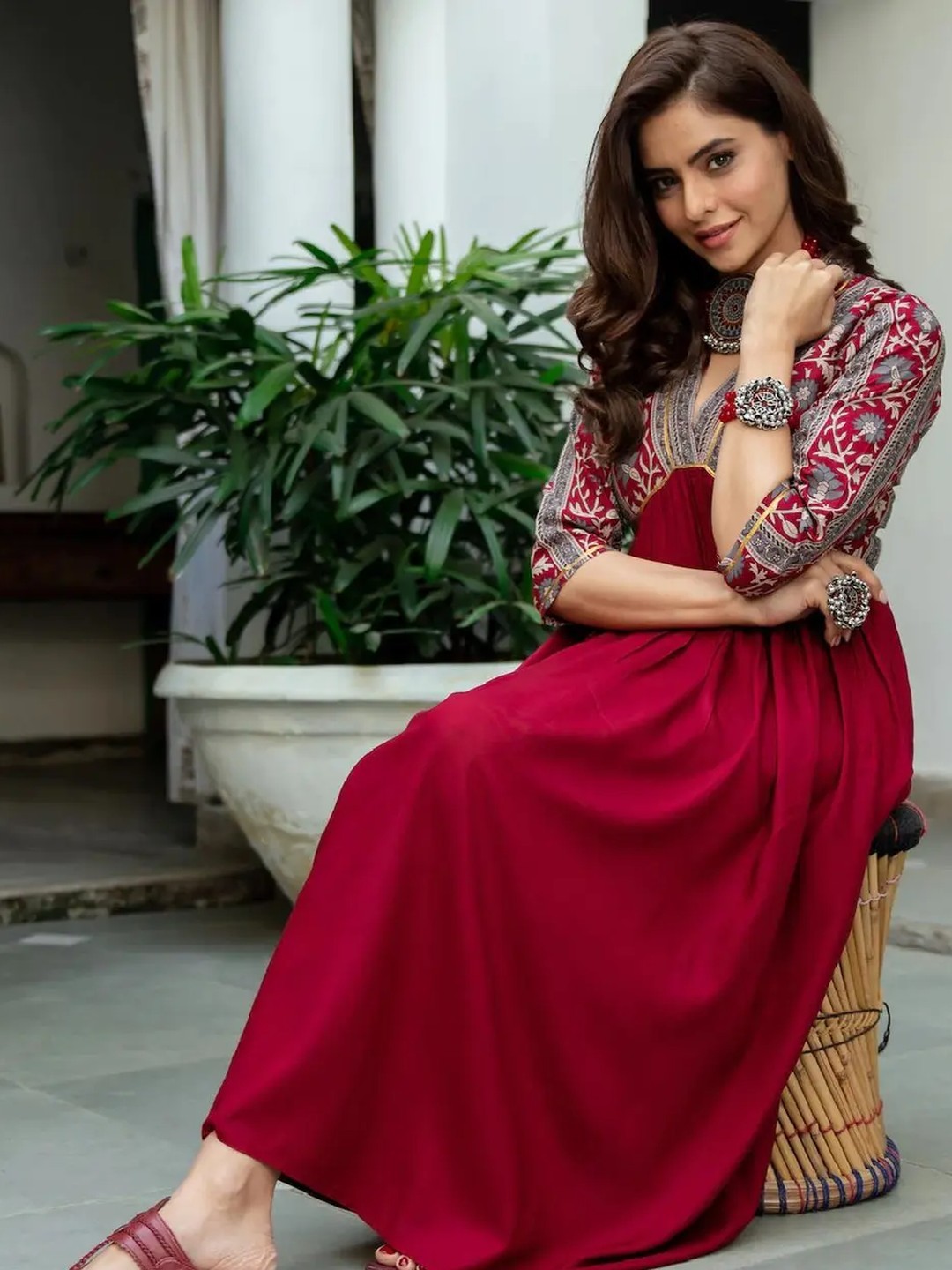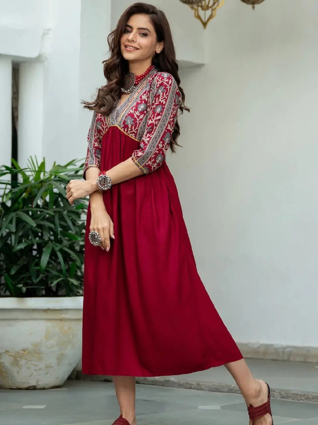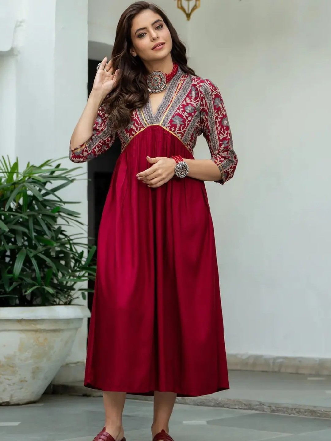 Product Name: Shri Ram Maroon Printed Alia Cut A-line Dress for Women