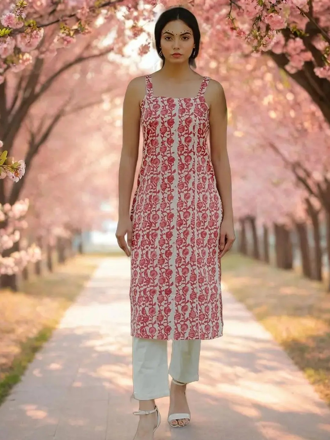 Product Name: Shri Ram Peach Sleeveless Floral Kurta Set for Women