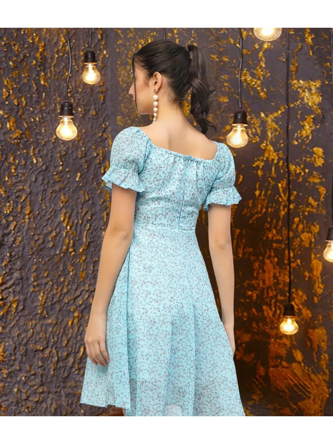 Product Name: Sky Blue Floral Tie-Up Mini Dress for Women