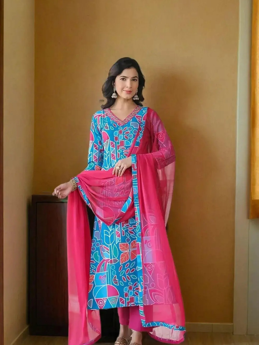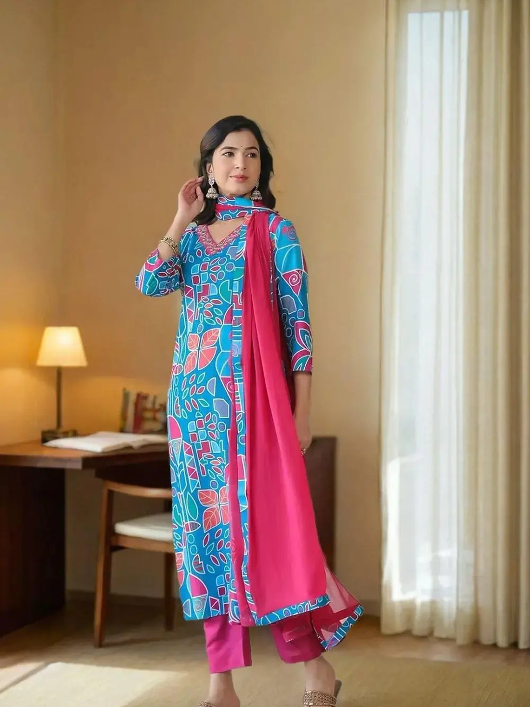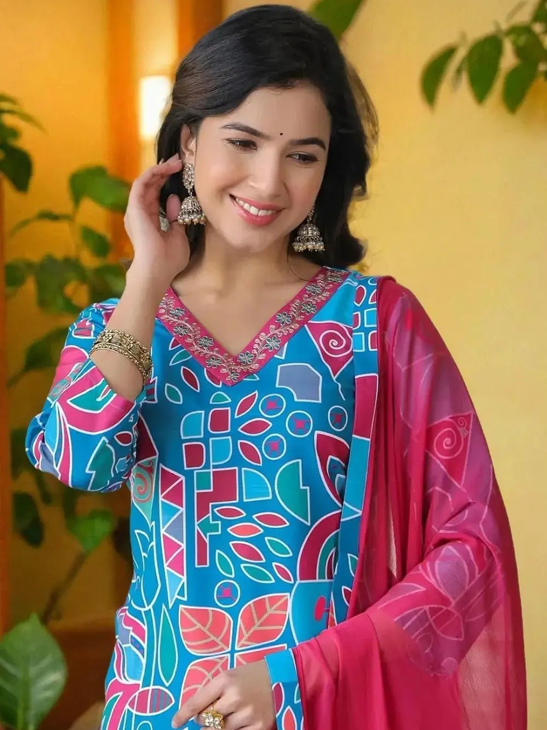 Product Name: Sky Blue Printed Straight Kurta Set for Women