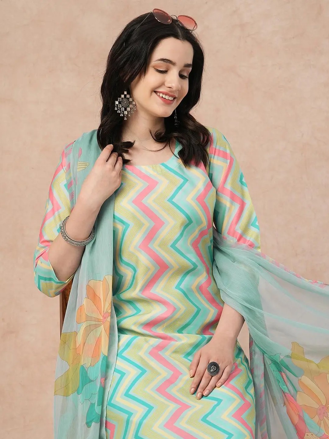 Product Name: Sky Blue Zig Zag Printed Kurta Set for Women
