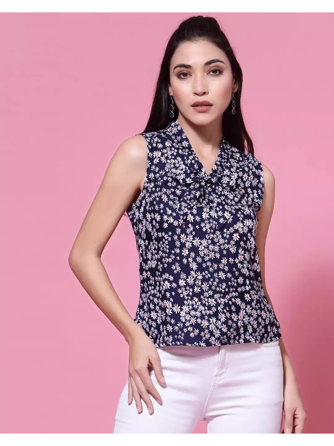 Printed regular top with a tie-up front, v-neck and sleeveless detail that gives you a graceful look. Made with crepe fabric, this top is light and breathable for summer days and can be flaunted with any bottoms for a flattering chic look.