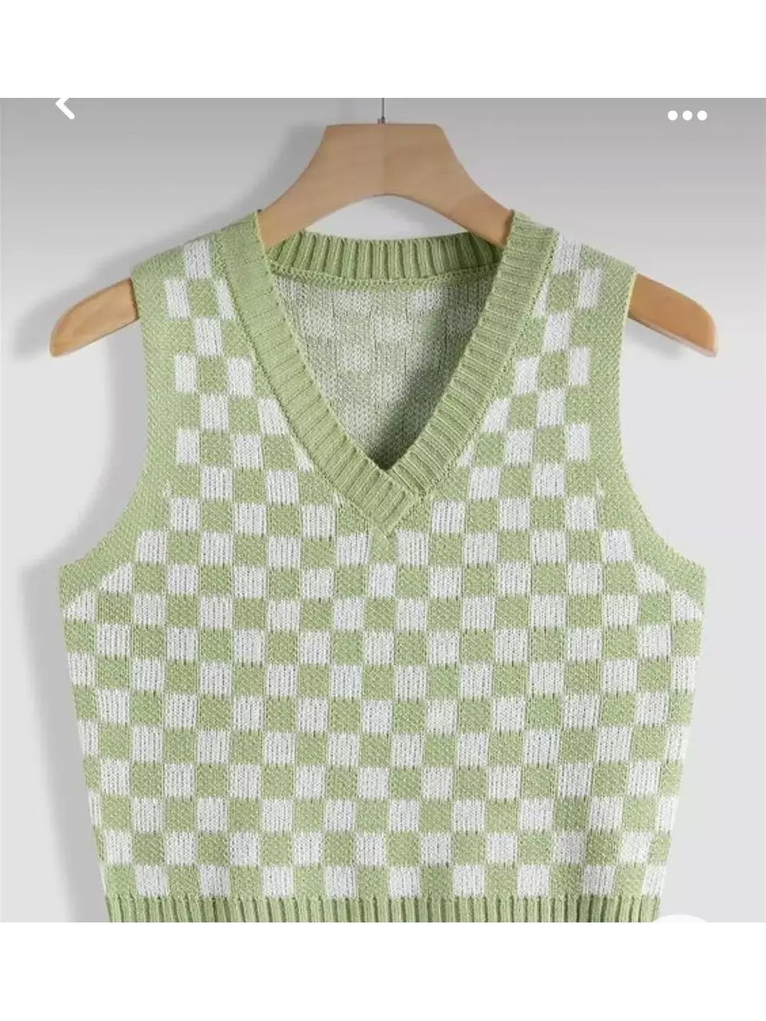 Product Type: Sleeveless V-Neck Knitted Checkered Sweater for Women Fabric: WoolColour: Olive Green & White Sleeve Length: Long Sleeves Pattern: Checkered Sizes: S, L, XL, XXL Country of Origin: India