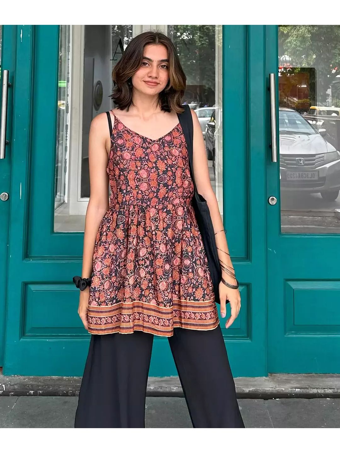 Product Type: Navy Blue & Brown Sleeveless V-Neck Tunic for WomenFabric: CrepeColour: Navy Blue & Brown Sleeve Length: SleevelessPattern: PrintedSizes: S (Bust Size: 35 in, Length Size: 29 in)XL (Bust Size: 41 in, Length Size: 30 in)L (Bust Size: 39 in, Length Size: 30 in)M (Bust Size: 37 in, Length Size: 29 in)Country of Origin: India