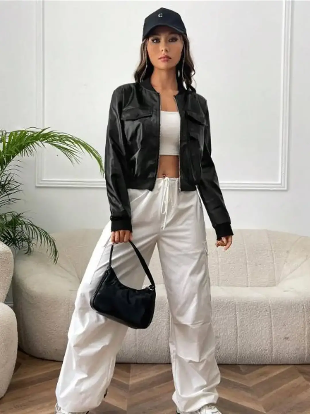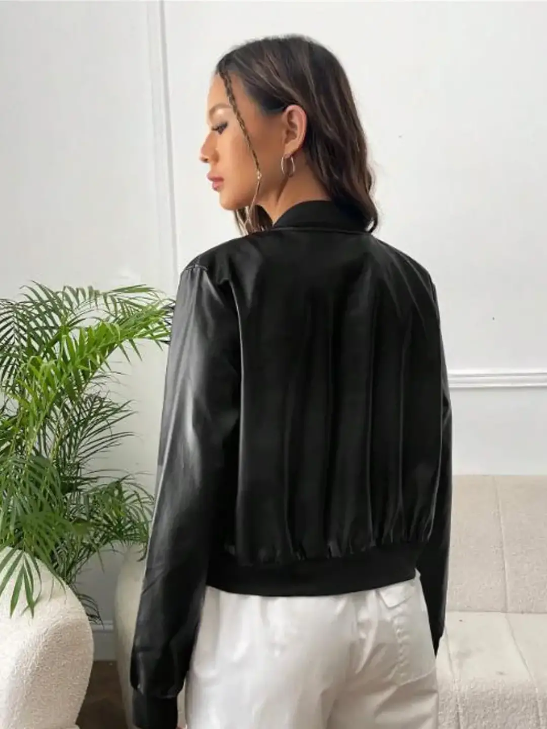 Product Name: Solid Black Cropped Leather Jacket for Women