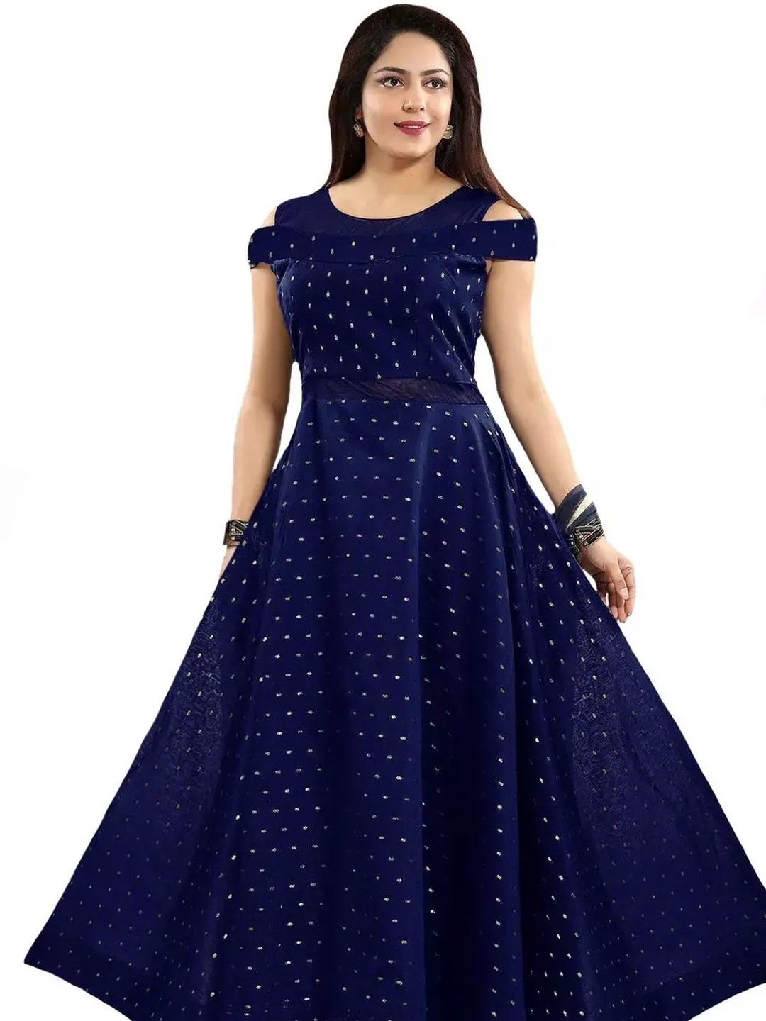 Solid Cold-Shoulder Embellished Gown for Women that has a flowy maxi length and a fit and flare fit. This cold-shoulder embellished gown can be styled with delicate accessories for a stunning look.