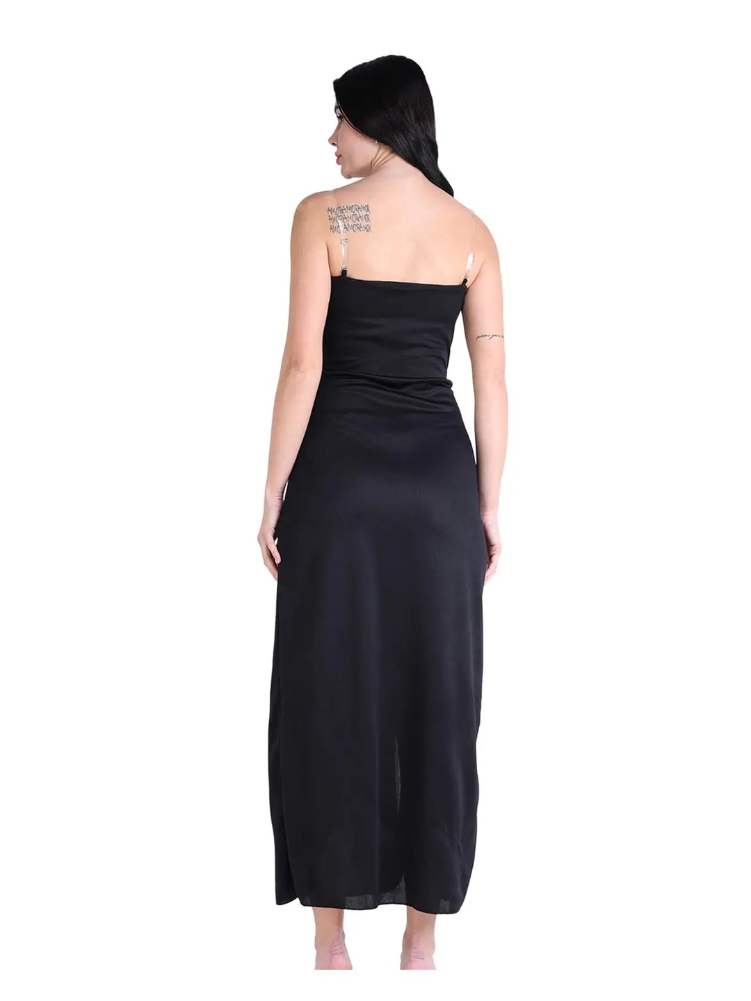 Solid Corset Slip Dress for Women that has thin spaghetti straps, a corset front, and a high slit that gives you an edgy elegant look. It has a square neck that enhances your cleavage and gives you a clean sophisticated look perfect for evening parties and dates.