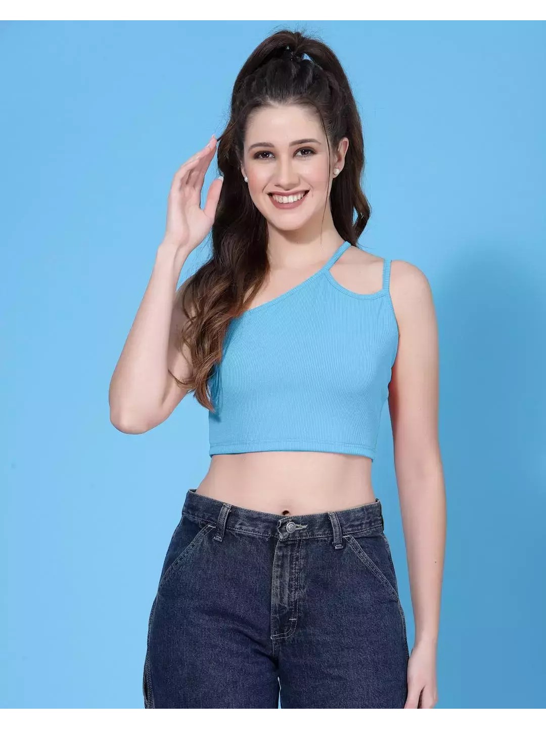 Crop tank top made with lycra that’s light, stretchable and comfy. It comes with one shoulder cut-out detail that makes the top unique and fashion-forward. The bodycon fit of this crop top effortlessly traces your curves and creates a desired silhouette.