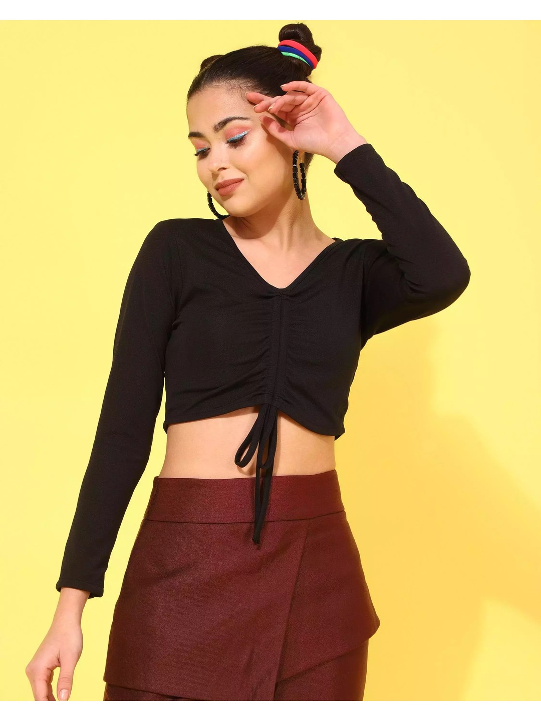 Solid crop top with long fitted sleeves and tie-up feature that gives you an attractive silhouette by contouring your natural curves. This lycra crop top is super comfy, and stretchy and comes with a v-neck that further adds to the elegance of this top. Style this top with any distressed boyfriend jeans for a balanced modern look.