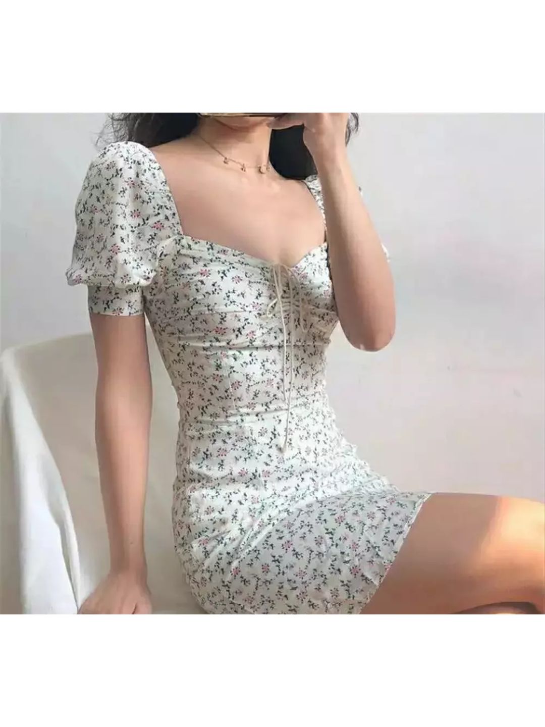 Product Type: Sweetheart Neck Puff Sleeve Front Tie-up Floral Dress for WomenFabric: LycraColour: White Pattern: PrintedSizes: XS, S, M, L, XLCountry of Origin: India