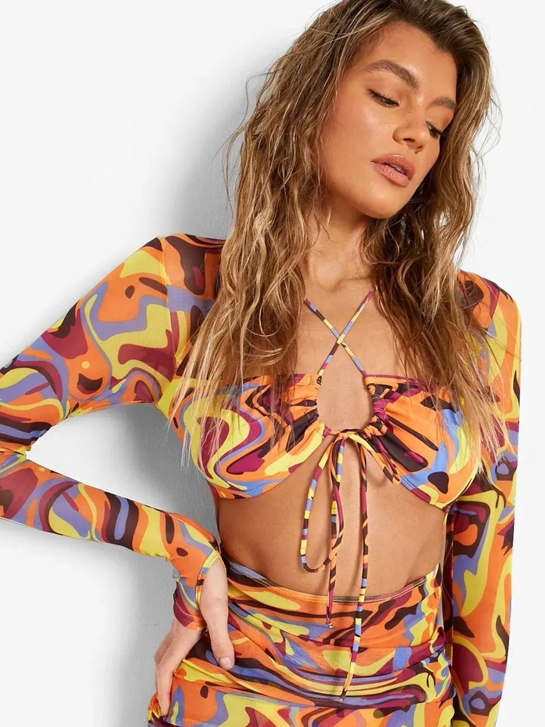 Embrace bold fashion with our tie-front long sleeve mini dress. This dress features a vibrant, retro-inspired print that adds a splash of color to any occasion. The tie-front design and keyhole cutout bring a playful touch, while the long sleeves ensure a chic and stylish look. This tie-front long sleeve mini dress is perfect for parties, festivals, or a night out, pair this dress with your favorite heels or boots to complete the standout outfit.