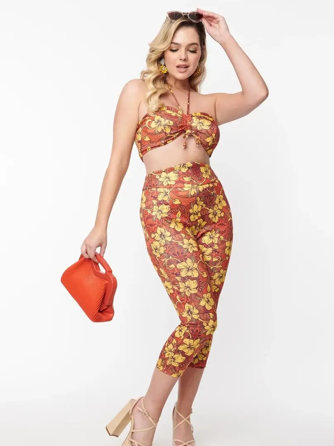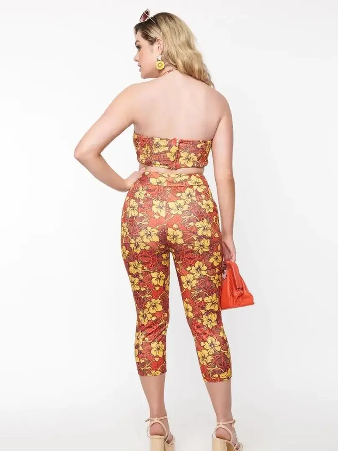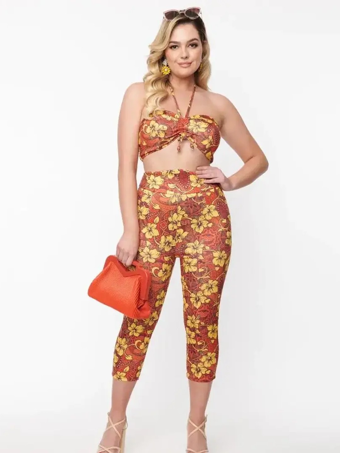 Turn heads with this stunning body-hugging vibrant floral printed co-ord set. Featuring a chic bralette top and trendy capri pants, this vibrant floral printed co-ord set is perfect for making a bold fashion statement. Pair it with strappy sandals and statement earrings for a complete look. Ideal for summer parties, beach outings, and casual get-togethers.