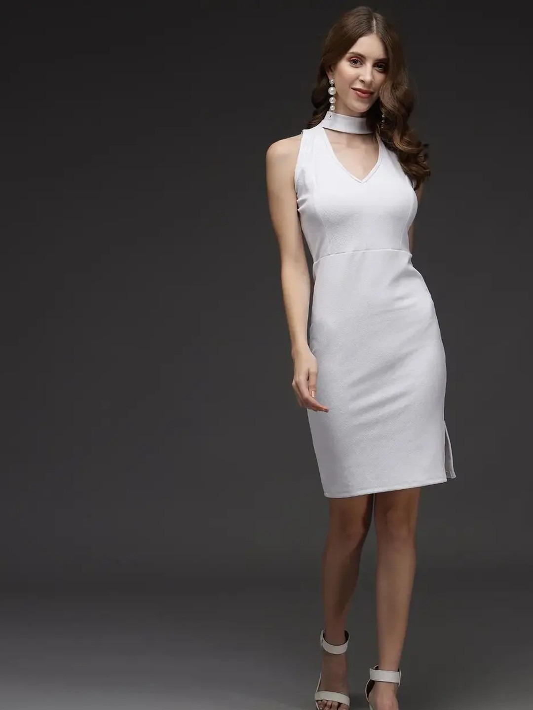 White Choker Midi Sheath Dress for Women that has a slim fit and a midi length. This choker midi sheath dress can be styled with delicate accessories for a chic statement look.