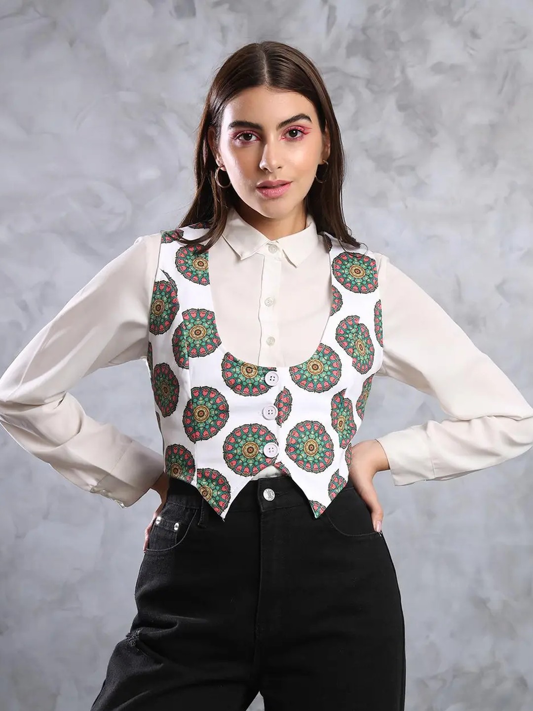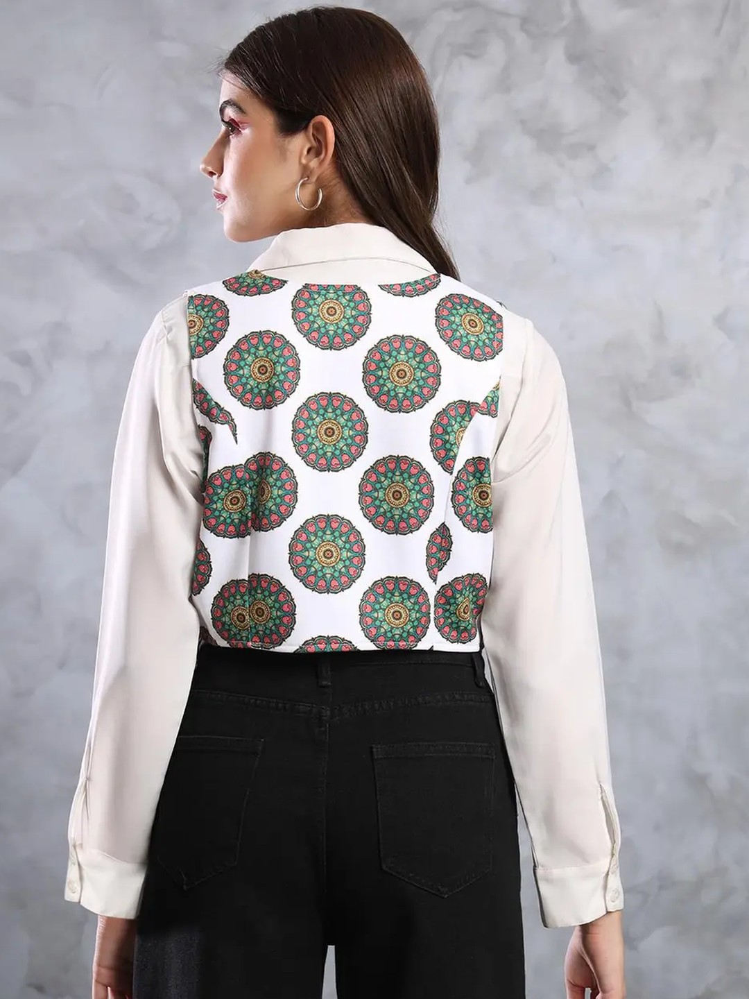 Product Name: White Ethnic Printed Vest Coat for Women