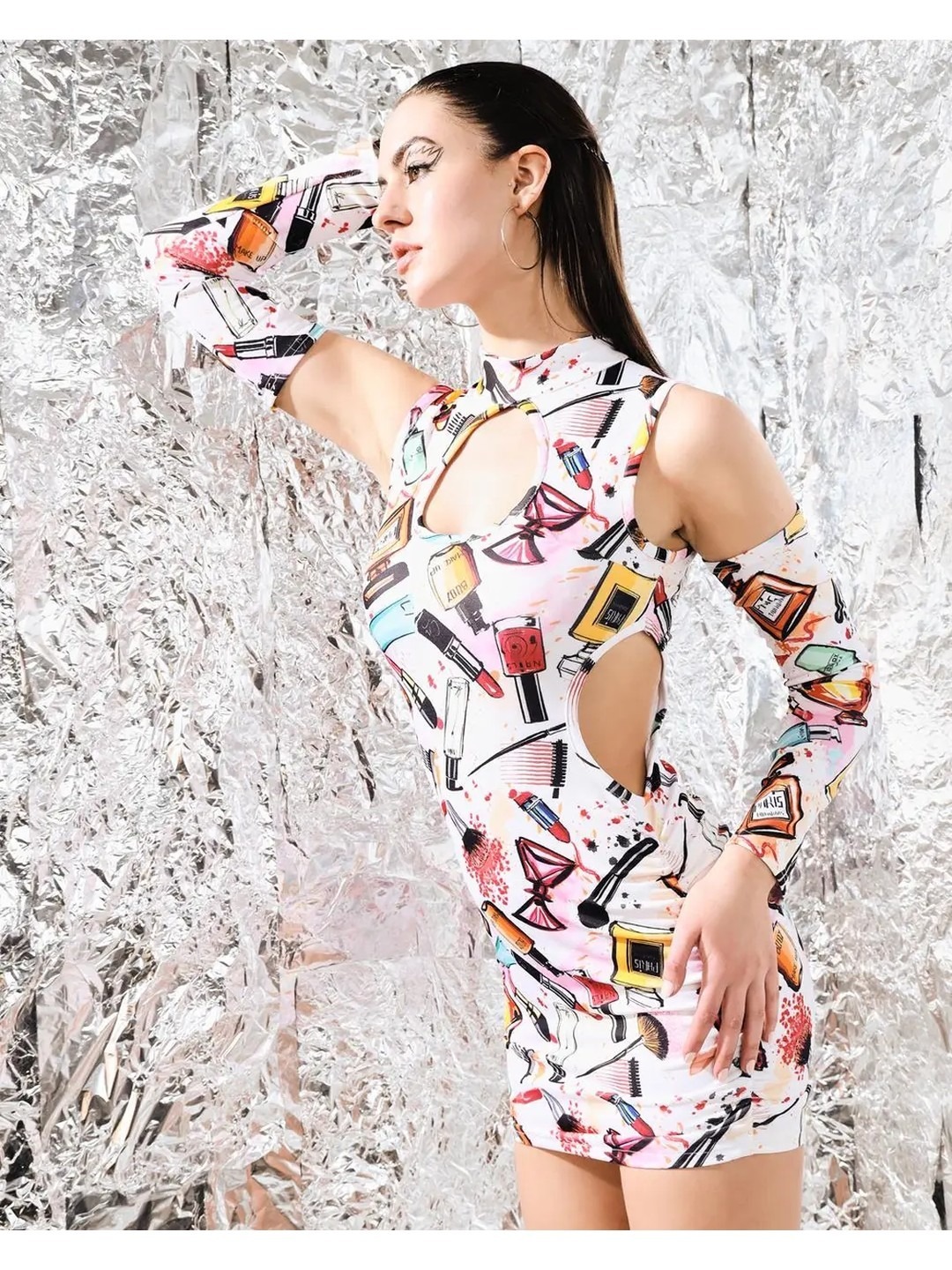 White Printed Cut-out Mini Bodycon Dress for Women that has quirky prints, mini length and cut-out details for a bold fashion-forward look. This lycra cut-out mini bodycon dress is a super fashionable choice that looks best styled with solid accessories.