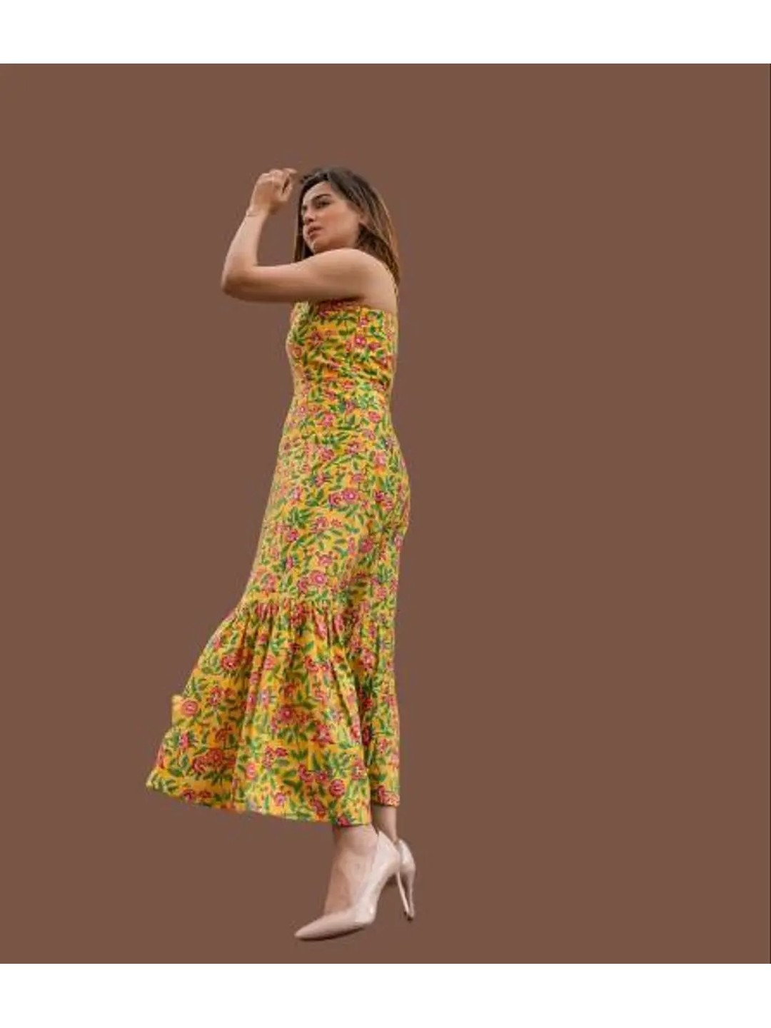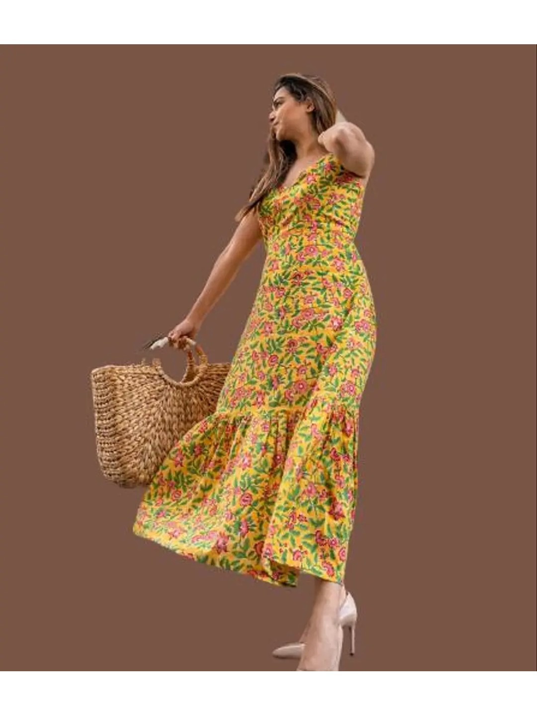 Product Name: Yellow Floral Tiered Midi Dress for Women