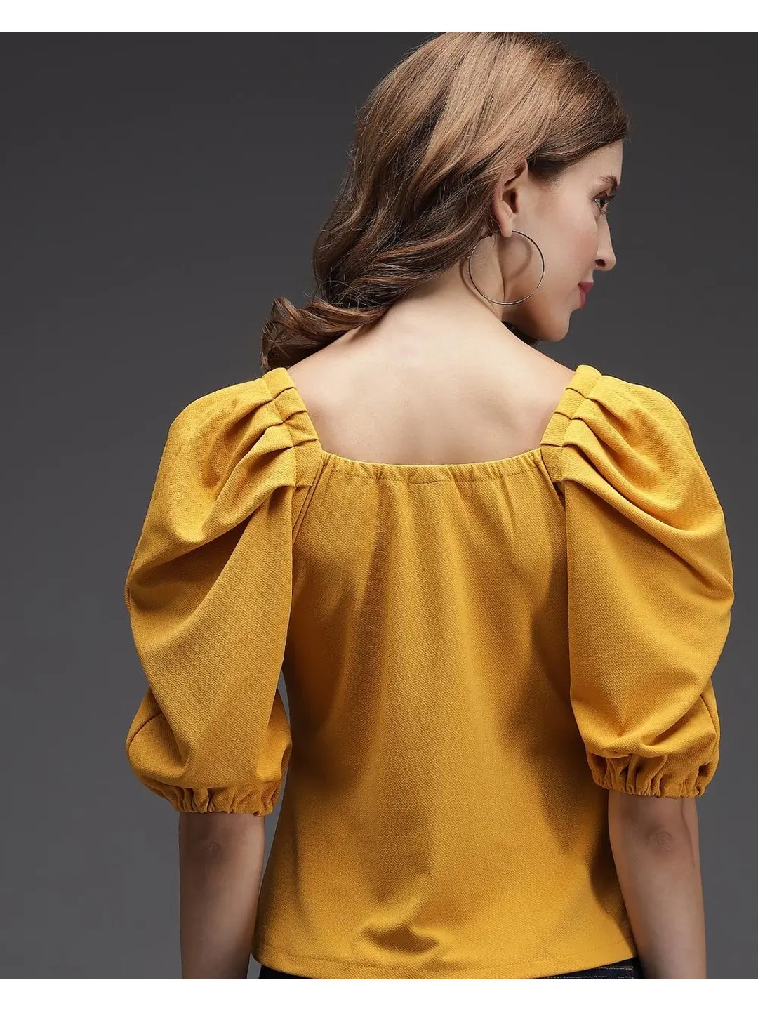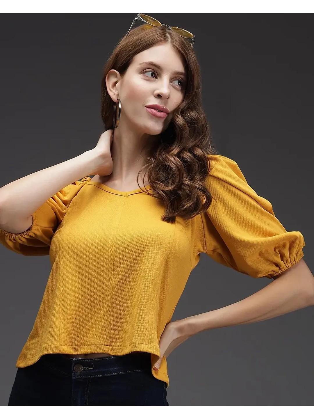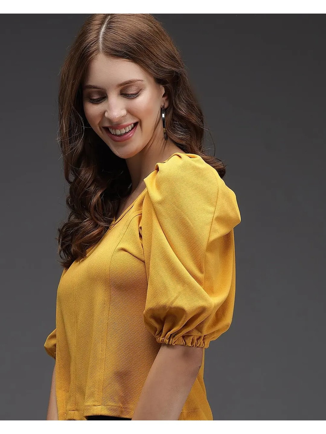 Yellow Puff Sleeve Top for Women that has three-quarter puff sleeves, regular length and a slim fit. This lycra puff sleeve top is stylish everyday wear that elevates your look effortlessly.